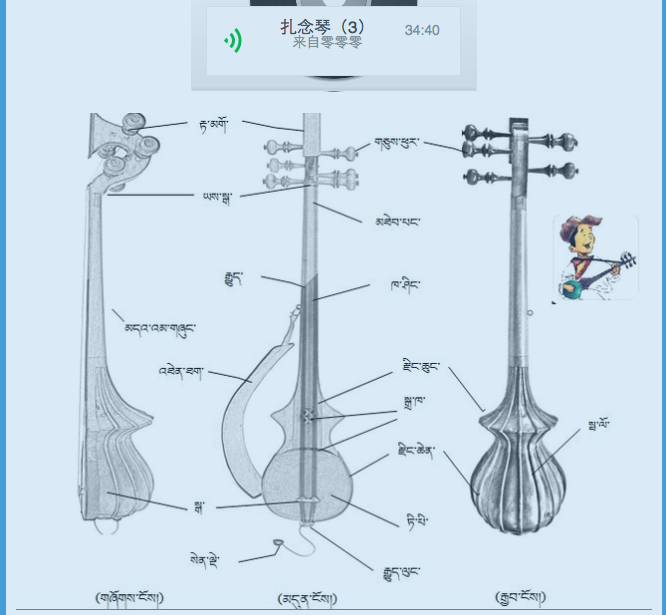 Le médiator, en os ou en plastique, chargé de mettre les cordes en vibration, est attaché au niveau du talon de l'instrument avec une cordelette pour ne pas le perdre.
